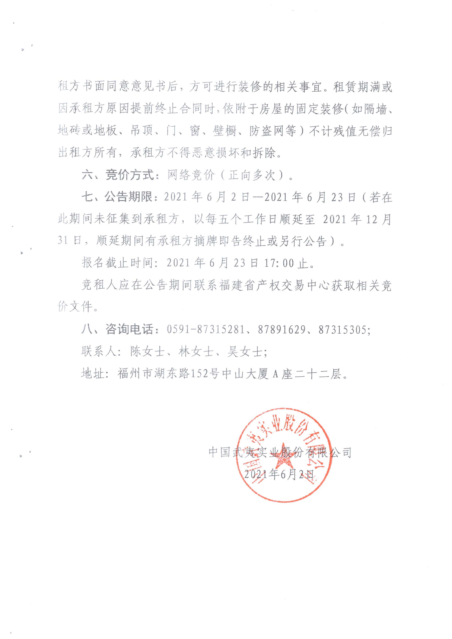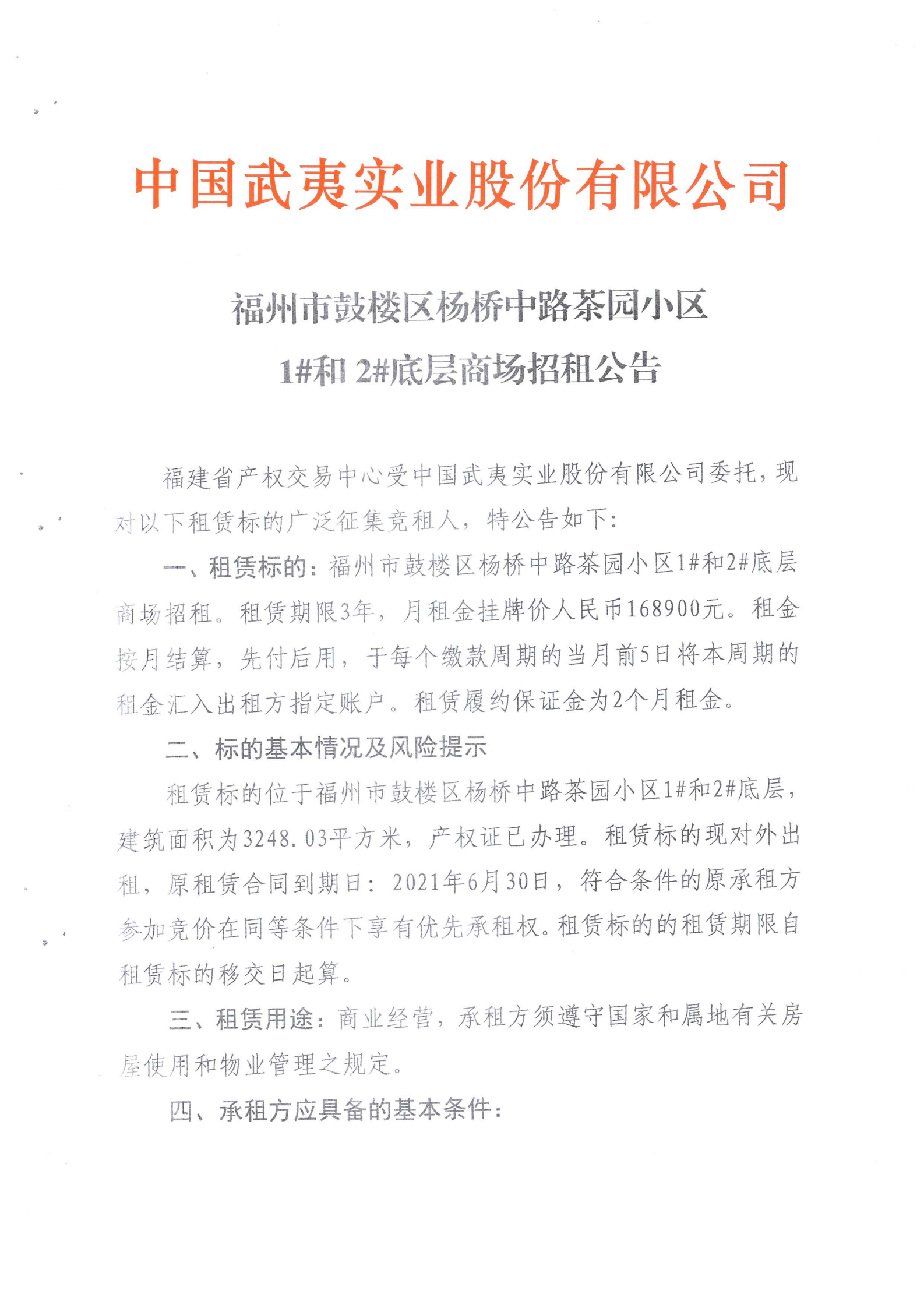 【招租公告】中國武夷實業(yè)股份有限公司關(guān)于福州市鼓樓區(qū)楊橋中路茶園小區(qū)1#和2#底層商場的招租公告